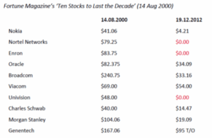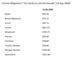 A now notorious issue of Fortune Magazine, published in August 2000, recommended Ten Stocks to last the Decade. Those stocks, and their share prices, are shown below.